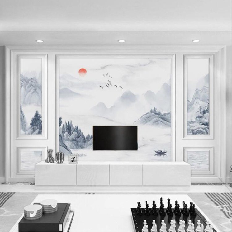 五宫格电视背景墙壁纸壁画水墨山水墙纸中式客厅影视墙装饰墙画布热门设计联盟服务商